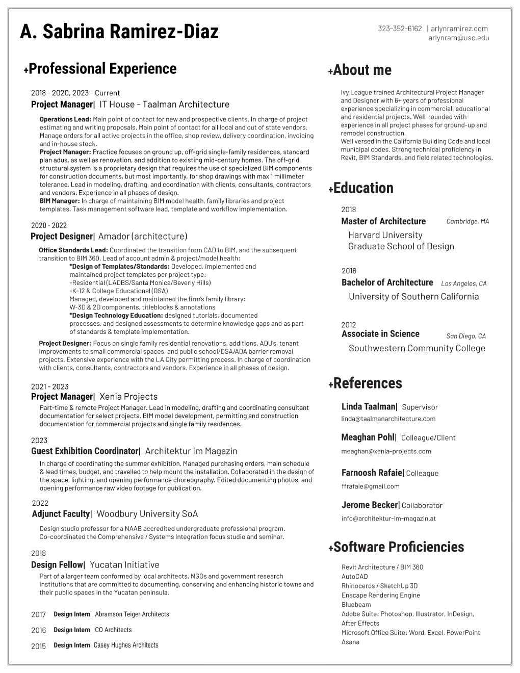 She received her Bachelor of Architecture from the University of Southern California School of Architecture and her Master in Architecture from Harvard University Graduate School of Design.